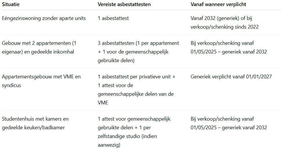 zodra er twee of meer wooneenheden zijn én minstens één ruimte die gemeenschappelijk gebruikt wordt, moet er een apart asbestattest voor die gemeenschappelijk gebruikte delen worden opgemaakt.