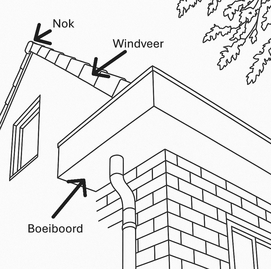 In de illustratie hieronder zie je duidelijk waar de nok, windveer en boeiboord zich bevinden. Drie asbestverdachte dakonderdelen die altijd in de bronfiche thuishoren, ook als ze niet te inspecteren zijn.